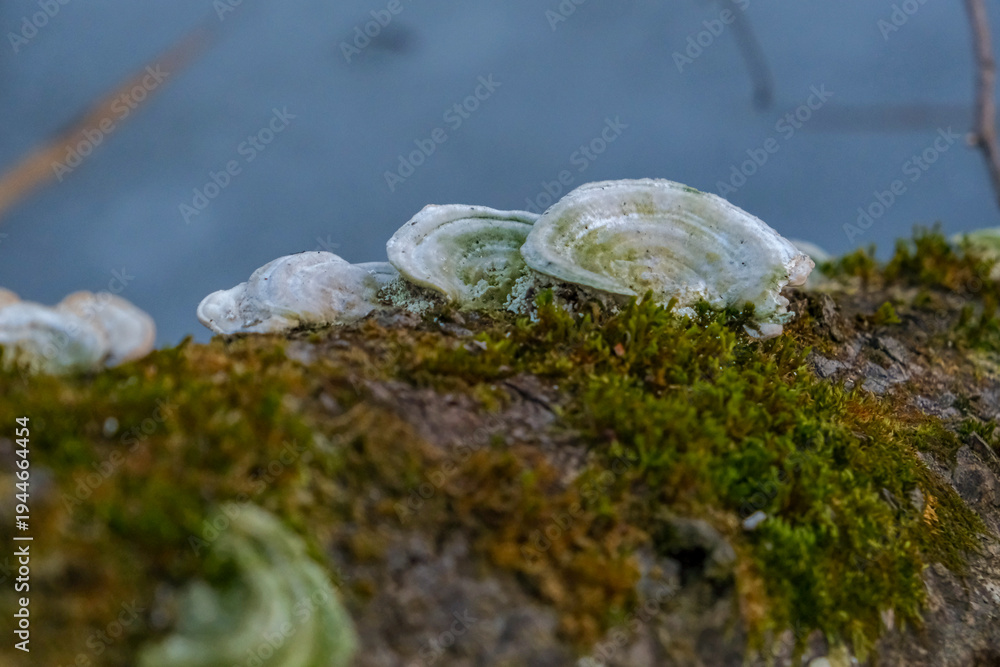 Hairy bracket fungus Trametes hirsuta on a log #1944664454