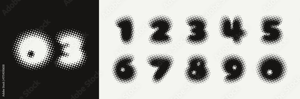 Halftone numbers in retro style. Blurred and fuzzy numbers with dots and circles. Raster spotted typeface. Vector illustration #1754310658