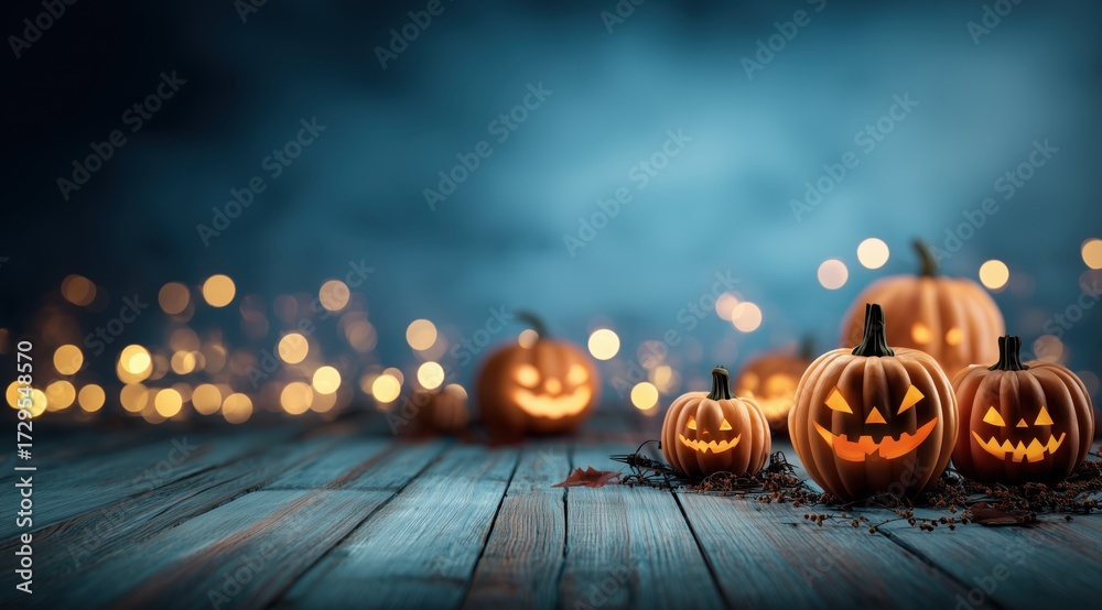 halloween background with pumpkins on a wooden table and light decorations halloween concept banner design. spooky halloween party decorations, a blue night sky, bokeh light effect Generative AI #1729548570