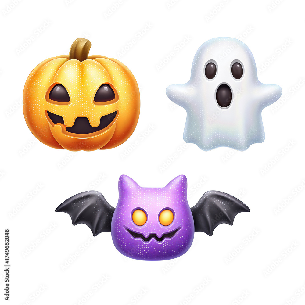 Halloween emoji trio featuring pumpkin, ghost, and bat, arranged in a triangle with glossy finish and vivid orange-purple tones, isolated on transparent background. #1749682048