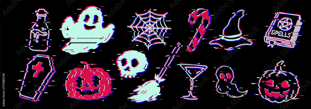 Halloween glitch icons set. Spooky ghost, pumpkin, skull, spiderweb, witch hat, broom, coffin, potion, spell book. Retro trippy horror style. Creepy distorted digital effect illustration. #1731885546
