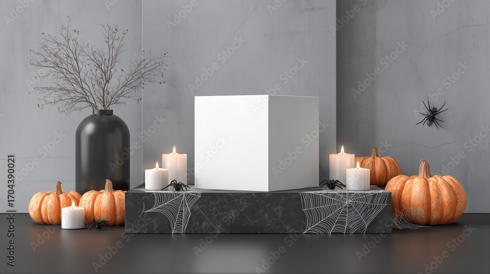 Halloween product mockup with pumpkins candles and cube on dark base #1704390021