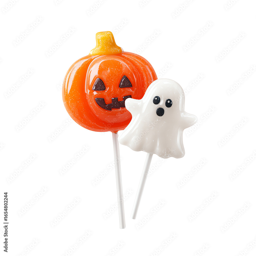 Halloween Pumpkin and Ghost Shaped Lollipop, Colorful Fun Candy Illustration, Floating Festive Treat PNG, Isolate on Transparent White Background #1654802244