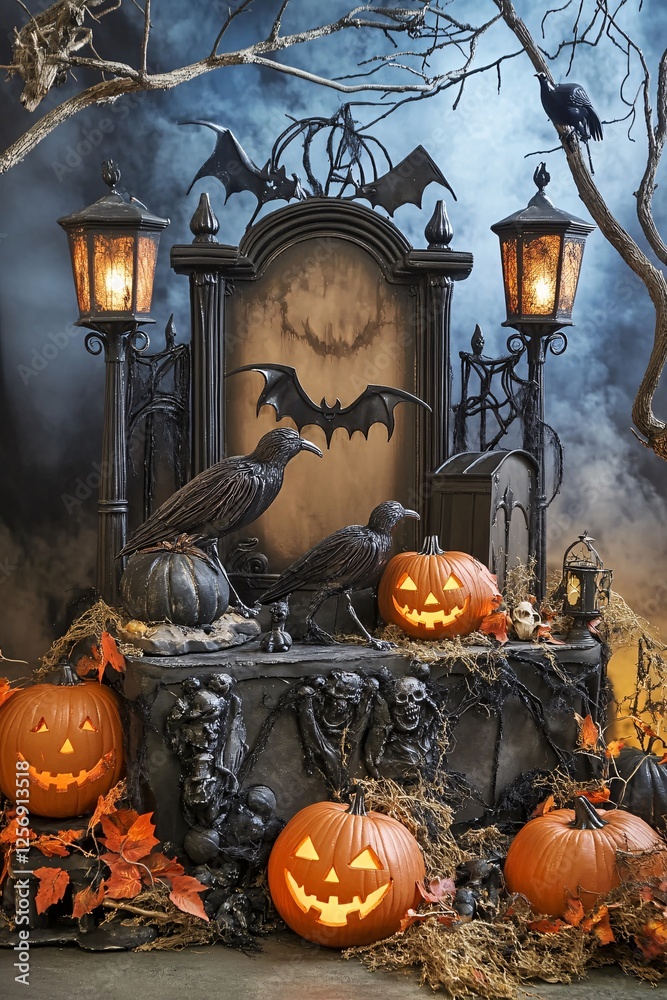 Halloween scene featuring carved pumpkins, spooky crows and old throne with scary background #1256913518