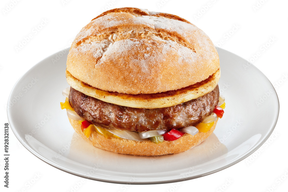 Hambúrguer de carne bovina com queijo provolone e molho de pimentões isolado em fundo transparente #1928321138