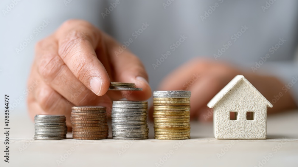Hand adding a coin to a stack of coins of increasing height, symbolizing saving money for a down payment on a house or paying rent, with a miniature house in the background #1763544777