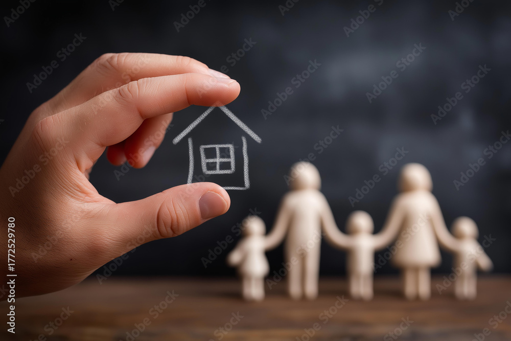 Hand drawing roof over family figures on chalkboard surface, faceless home ownership, property concept visualization, defocused background blur, real estate symbol, family housing #1772529780