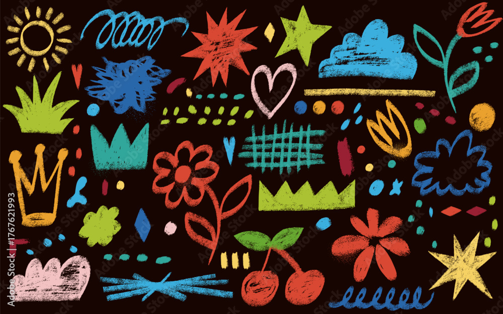 Hand drawn colorful charcoal grunge doodle shapes and squiggles in childish girly style set. Vector art pencil drawings. Colored crown, stars, sky, flower, heart, grid doodle collage elements. #1767621993