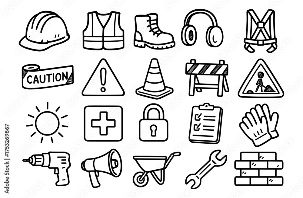 Hand drawn construction and safety icons set with tools and signs #1753269867