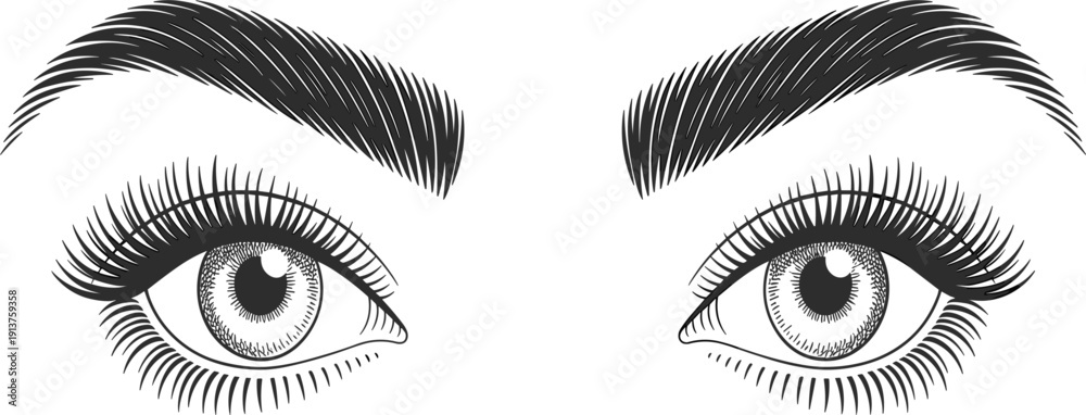 Hand drawn female eyes with long lashes, vintage eyelash sketch beautiful woman brows makeup vector art #1913759358