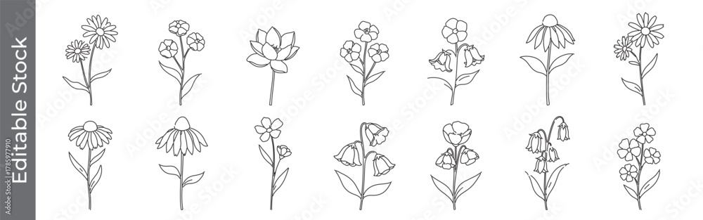 Hand drawn flower line icon set – editable outline symbols of floral, doodle, botanical, wildflower, and nature illustration #1785977910