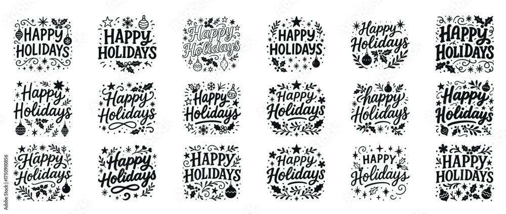 Hand Drawn Happy Holidays Lettering with Christmas Ornaments, Winter Foliage, and Festive Illustrations #1750900856