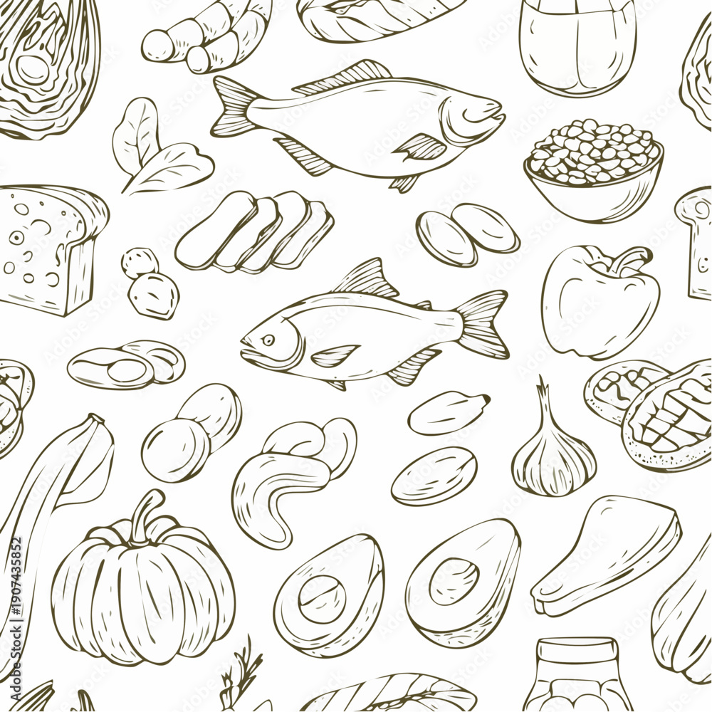 Hand Drawn Healthy Food Ingredients Seamless Pattern Line Art. #1907435852