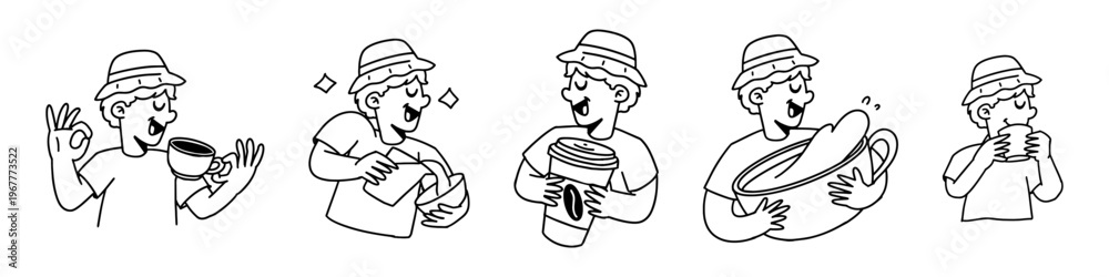 Hand Drawn Illustration Set of Male Characters Holding Various Coffee Drinks Line Art #1967773522