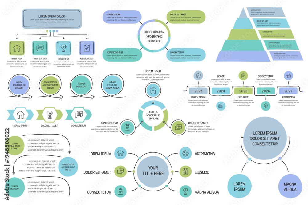 Hand drawn infographic templates set - diagrams, timeline, flow charts, pyramid and other templates #1948808022