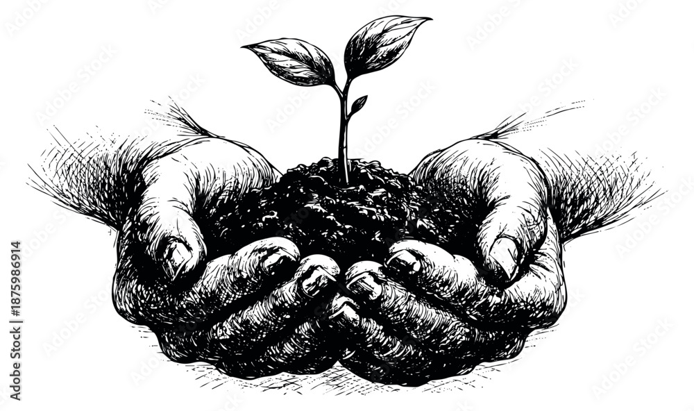 Hand drawn line art illustration of human hands depicting cradling a small plant sprout with soil for concepts of growth and sustainability #1875986914