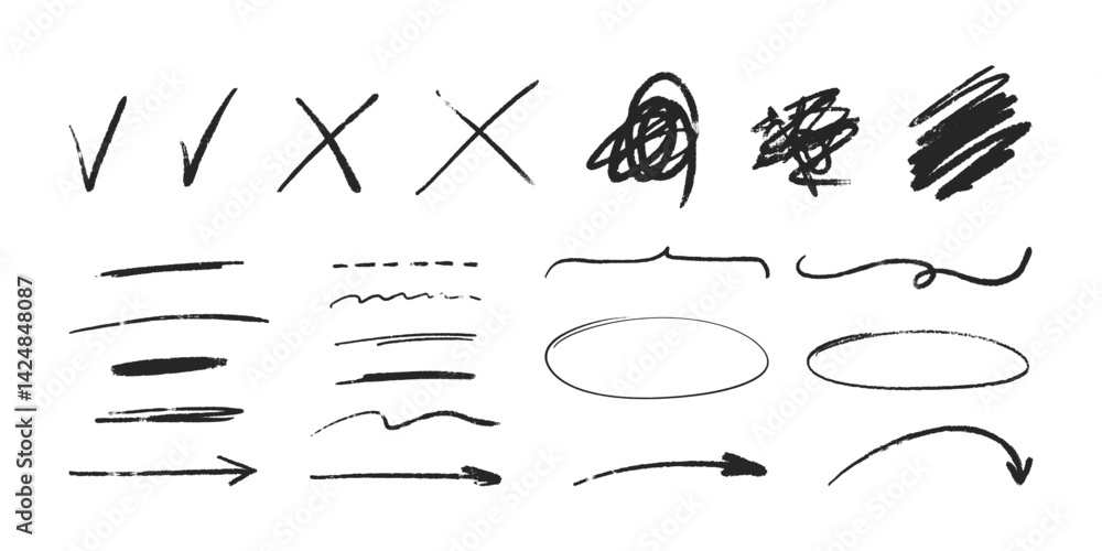 Hand drawn marker elements. Freehand vector signs. Ticks, crosses, arrows and circles for highlighting and notes. #1424848087