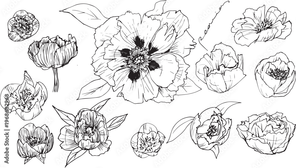 Hand drawn peony flowers in loose marker style vector illustration #1968682968