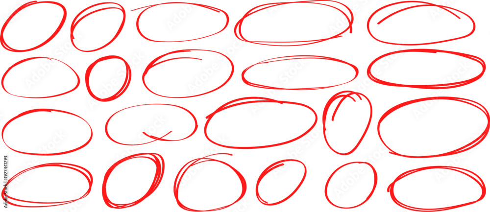 Hand drawn red circle highlight set, marker pen oval scribble collection #1927441293