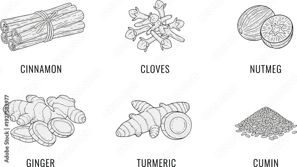 Hand drawn spice set outline illustration, flat vector collection of cinnamon cloves nutmeg ginger turmeric cumin isolated on white background #1927583977