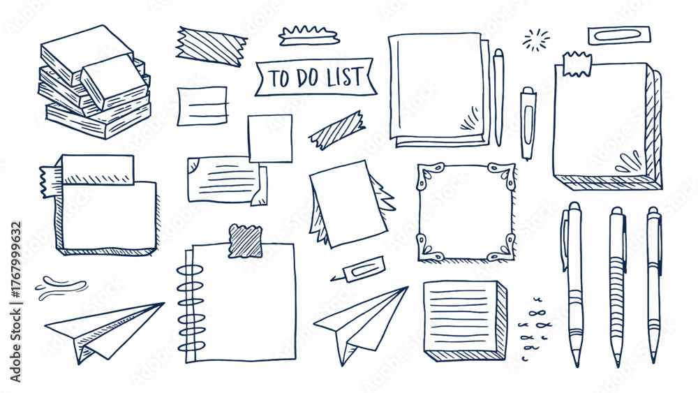 Hand drawn stationery doodle set with to do list paper notes pens paper plane frame tape sketch office vector illustration #1767999632