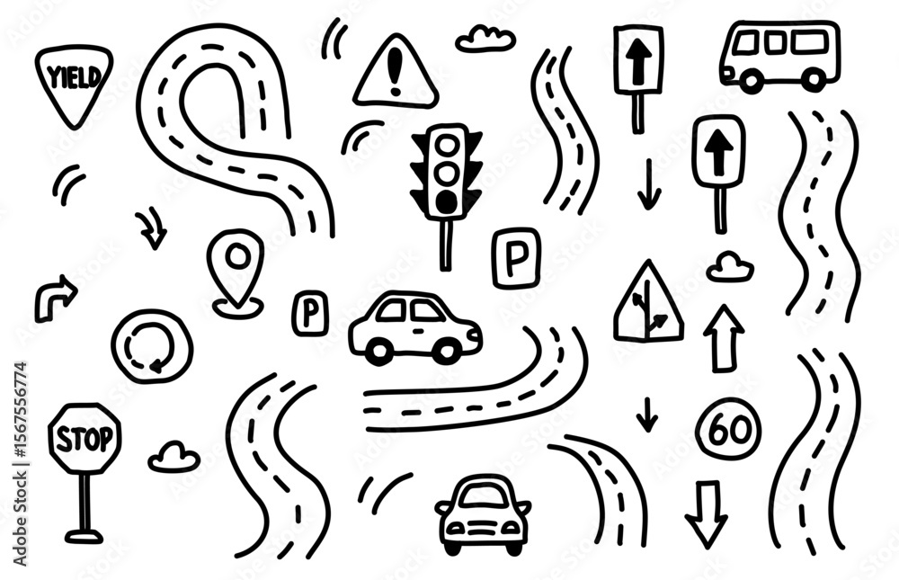 Hand-drawn traffic and road doodle icons set. Sketch style transportation elements including cars, roads, road signs, arrows, traffic lights, and parking symbols. Perfect for education, maps. #1567556774