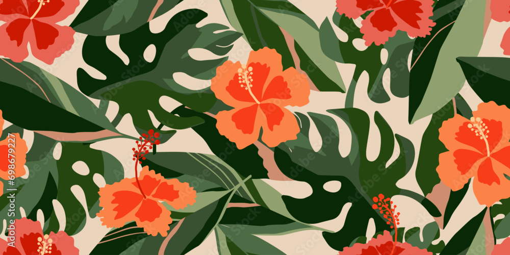 Hand drawn tropical flowers, seamless patterns with floral for fabric, textiles, clothing, wrapping paper, cover, banner, interior decor, abstract backgrounds. vector illustration. #698679227