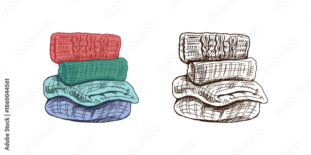 Hand drawn vintage sketch of folded knitted sweaters in color and monochrome version, warm winter woolen clothes stack #1860044561