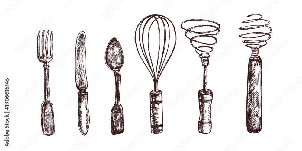 Hand drawn vintage sketch of kitchen utensils set with cutlery and wire whisks in monochrome, isolated illustration #1906615145
