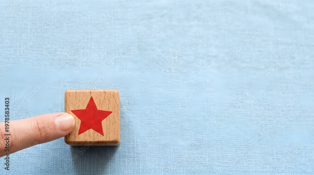 Hand Gesture Touching Red Star Block Blue Bokeh Soft-Focus Background Dynamic Lighting Minimalist Design Capturing Scale Contrast Wood Grain Texture #1978583403