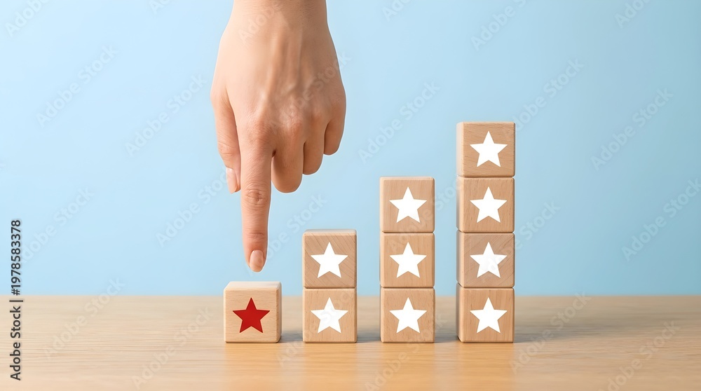 Hand Gesturing to Red Star Block on Scale with Blue Contrast Background High-Key Lighting Minimalist Style gesture #1978583378