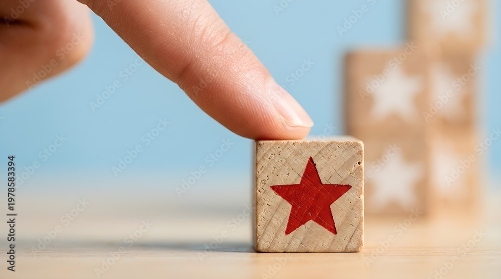 Hand Gesturing Towards Red Star Block Minimalist Design Against Light Blue Background High Contrast Lighting Capturing Delicate Wood Grain Texture gesture scale #1978583394