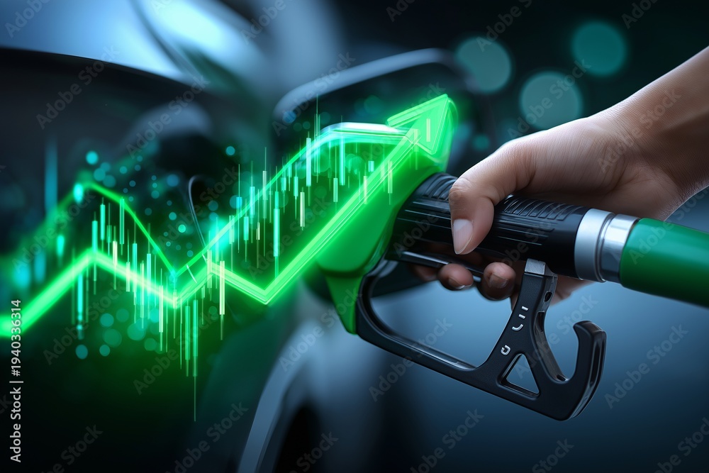 Hand hält Zapfpistole vor digitalem grünen Börsenchart – Energie und Finanzen #1940336314