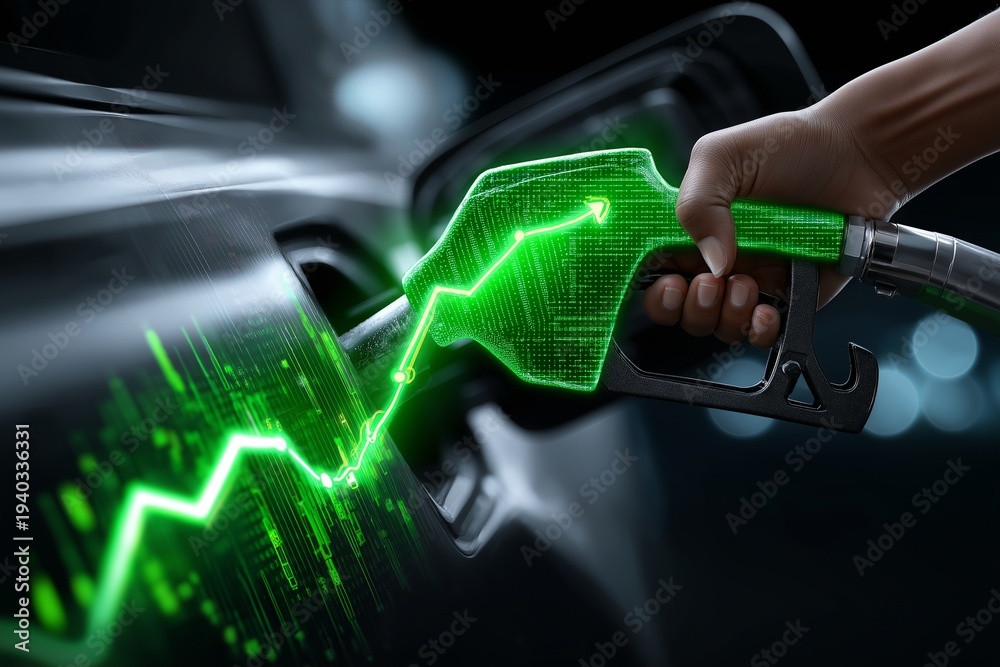 Hand hält Zapfpistole vor digitalem grünen Börsenchart – Energie und Finanzen #1940336331