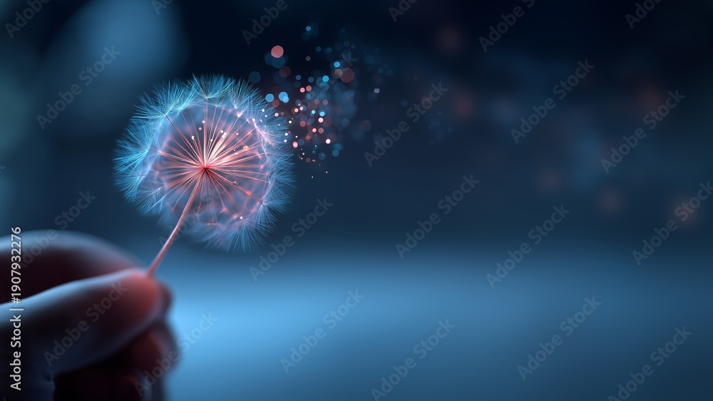 Hand hält zarte Pusteblume mit Samenschirmchen vor unscharfem Hintergrund mit warmem Bokeh #1907932276