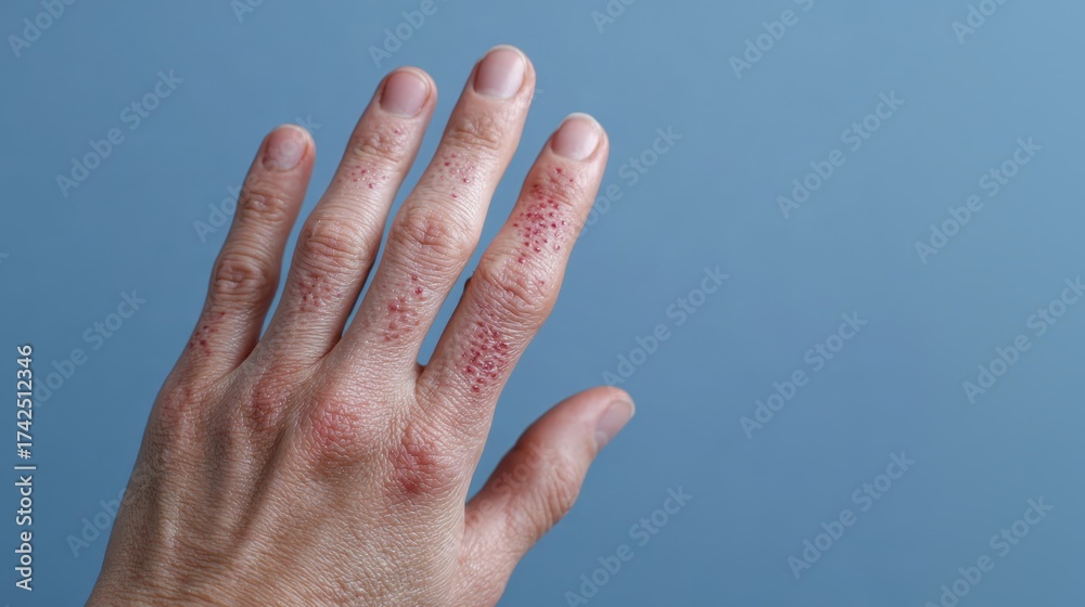 Hand having acute dyshidrotic eczema with multiple small red itchy fluid filled blisters - vesicles - and inflamed skin on fingers during an allergic reaction #1742512346