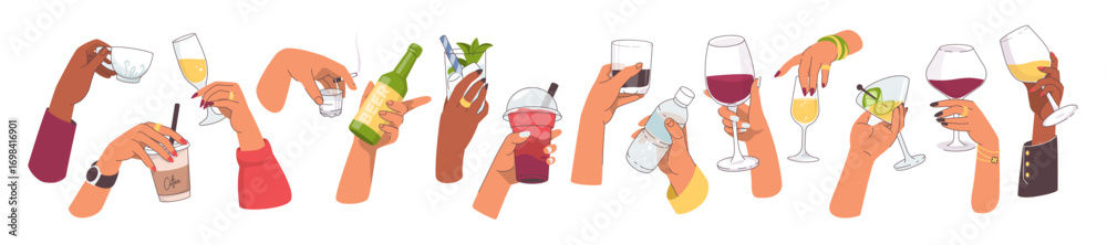 Hand hold drinks set. Beverages in glasses, takeaway coffee and tea, wineglass and cup. Beer and cold cocktail, champagne and lemonade, party arms. Vector cartoon isolated illustration #1698416901