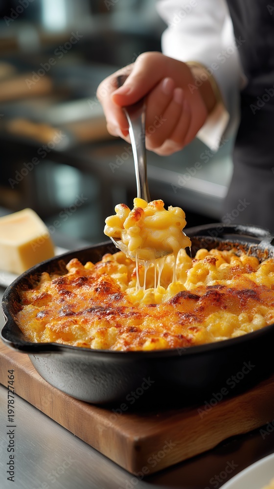 Hand holding a fork serving cheesy macaroni and cheese from a cast iron skillet on a wooden board in a modern kitchen setting with blurred background #1978727464