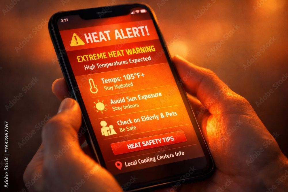 Hand holding a mobile device showing a critical public alert for extreme heat, providing important safety tips and information about high temperatures and heat safety #1932862767