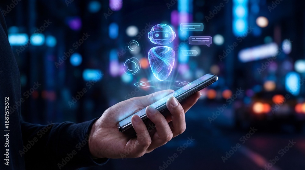 Hand holding a smartphone projecting a glowing holographic artificial intelligence chatbot interface #1887575312