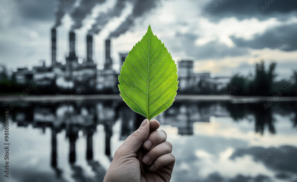 Hand holding a vibrant green leaf, clear reflection of industrial pollution in the background, symbolizing the contrast between genuine environmental efforts and deceptive greenwashing #981659495