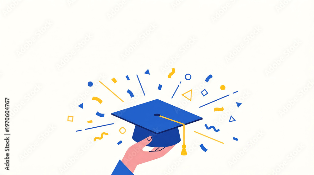 Hand holding blue graduation cap with yellow tassel amidst festive confetti expressing joy and proud achievement on white background #1970604767