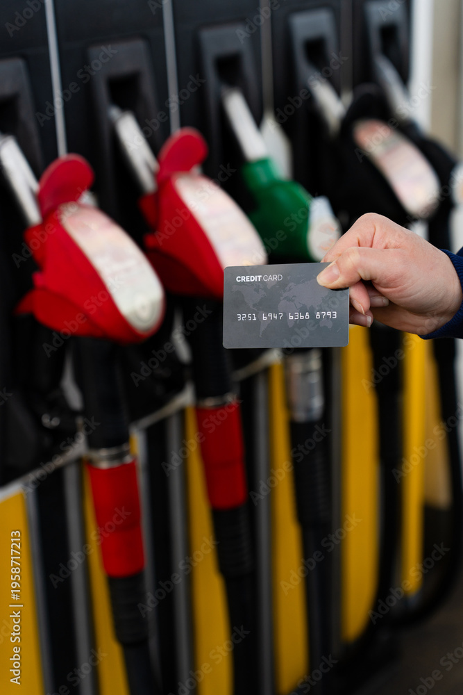 Hand holding credit card at gas station highlighting rising fuel costs. #1958717213