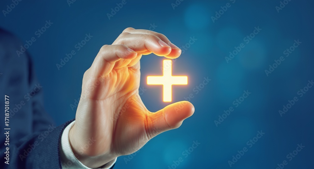 Hand holding glowing plus sign, positive symbol, growth concept, add button, medical icon, digital technology, success, future, progress, innovation, healthcare, interface, user experience, websi #1718701877
