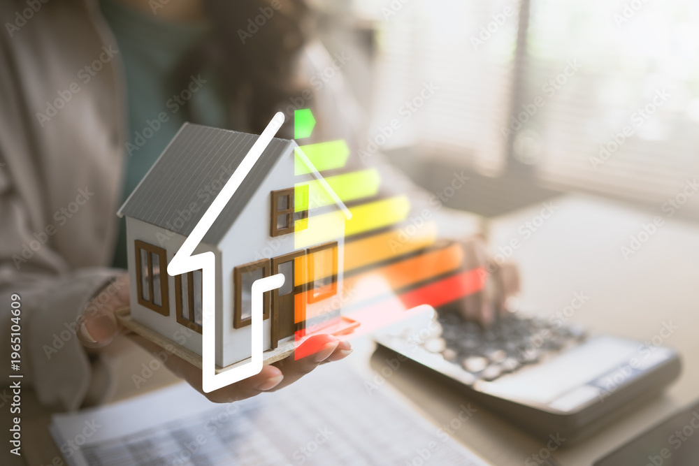 Hand holding house model with energy efficiency rating scale, representing sustainable home, energy saving, cost reduction and environmental protection. #1965104609