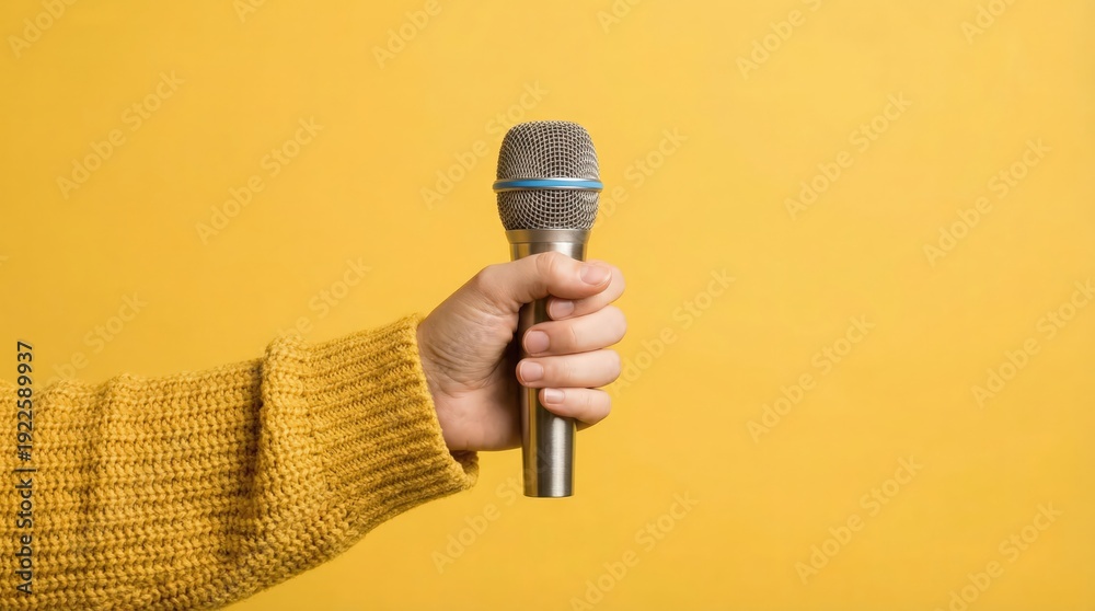 hand holding microphone over yellow background, panoramic mock up image broadcasting, announcement, announce, background, audio, clipping, cable #1922589937
