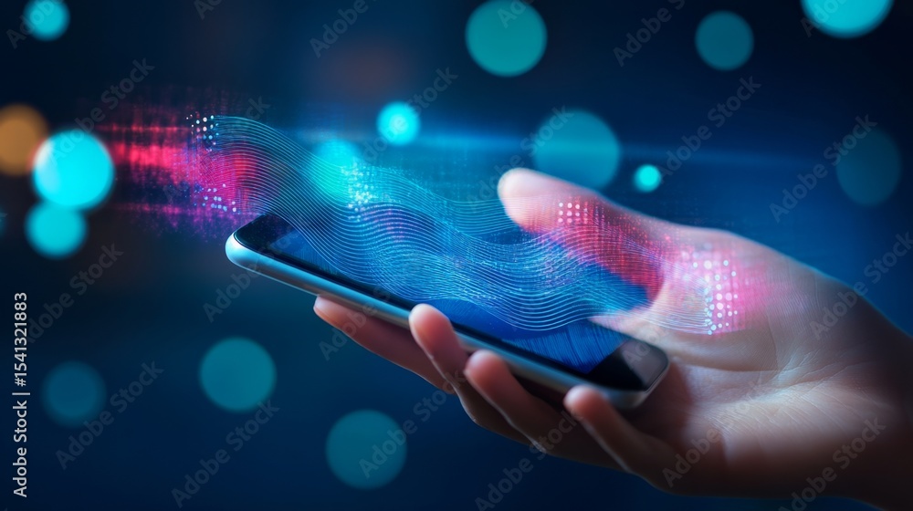 Hand holding mobile device with floating AI screen showing voice recognition waveform #1541321883