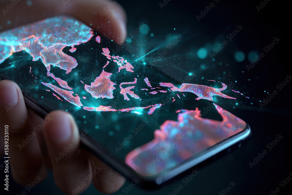Hand holding phone, Southeast Asia map projection #1589233110