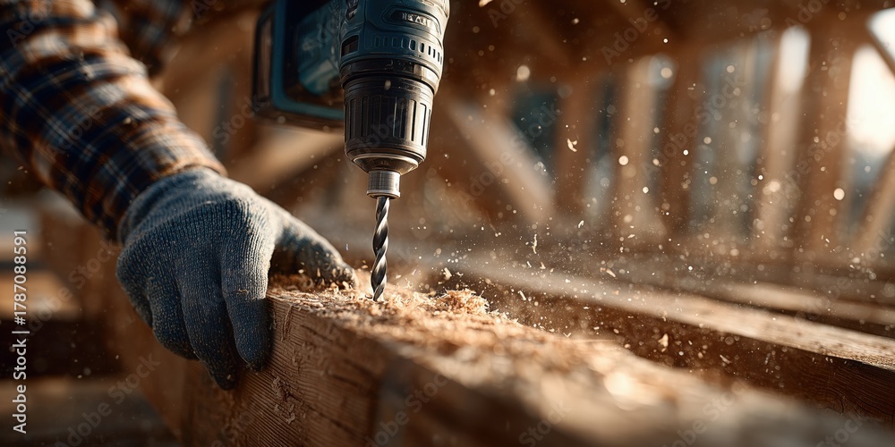 Hand Holding Power Drill while Creating Wood Shavings in Construction Site with Natural Light #1787088591