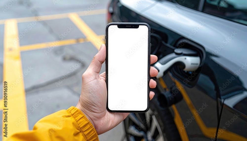 Hand holding smartphone with blank white screen in front of electric vehicle charging at station in parking lot #1930916519